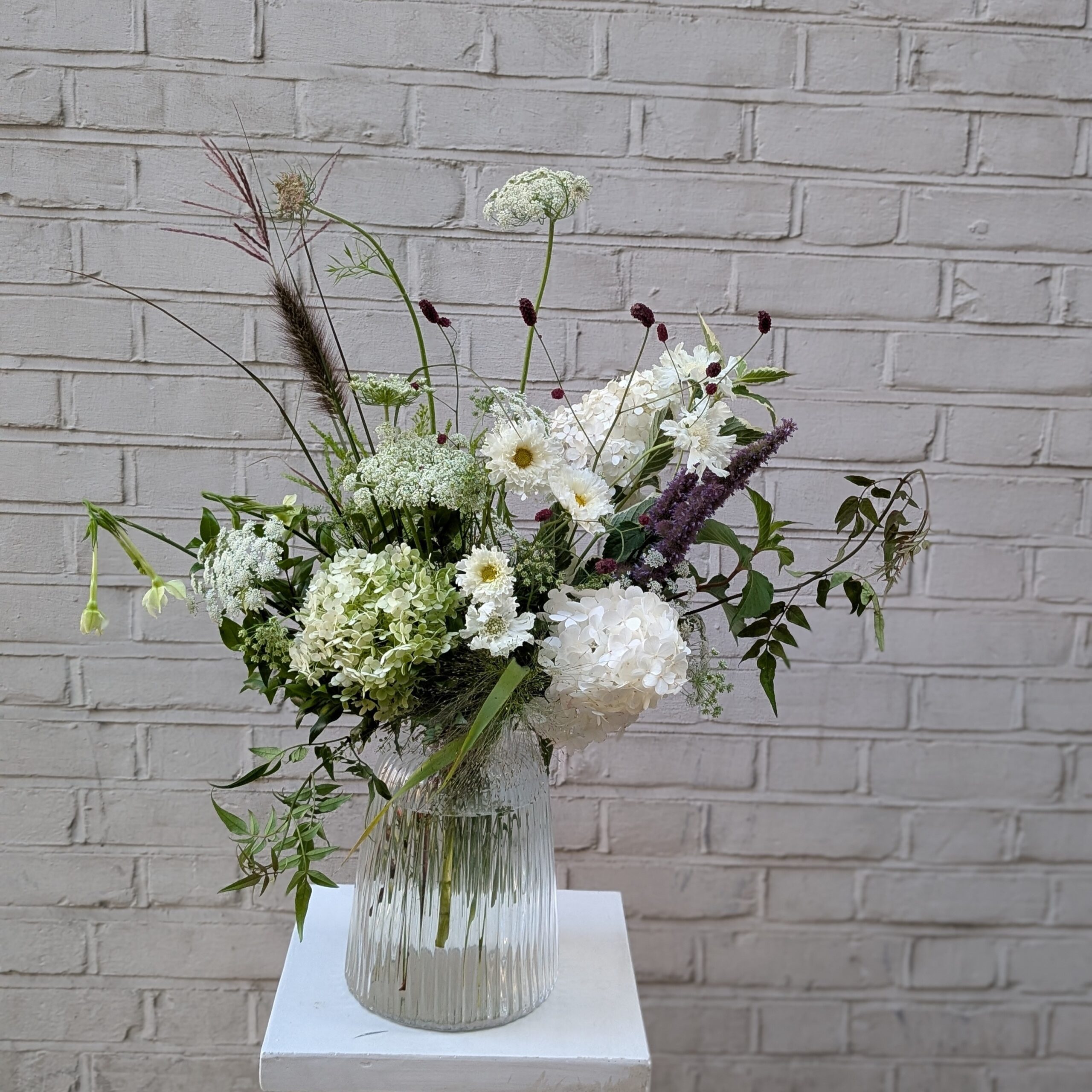 Hydrangea, Roses, Grasses, Sanguisorba, Teasels, Reeds, Anemones, Paperwhites, Parrot Tulips, Echinacea, Ammi, Viburnum.