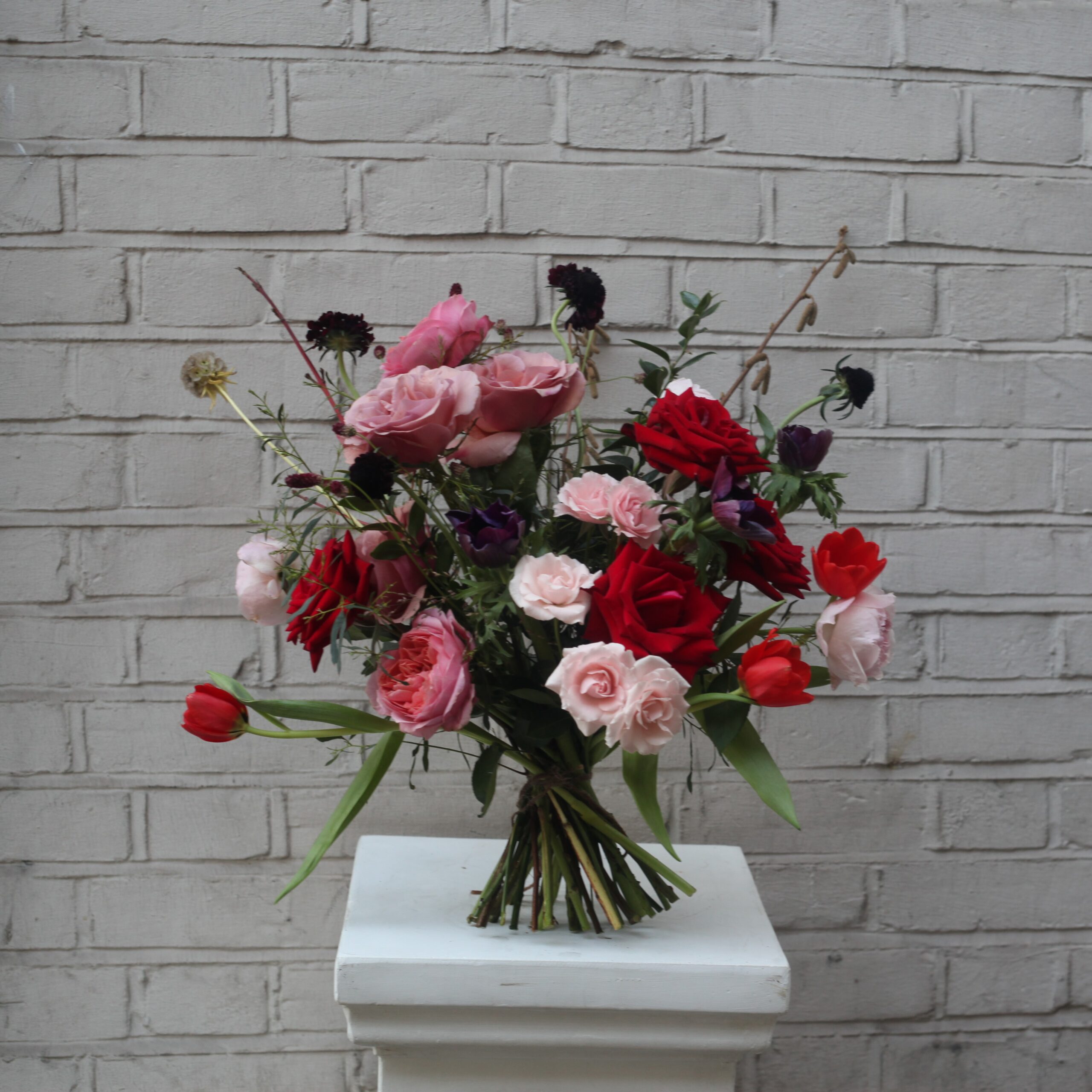 A rich composition of velvety reds, deep burgundy and inky blackcurrant tones, softened with blush and pale pink for contrast and depth. Layered with textured seasonal blooms and natural British foliage, it is designed to feel expressive, generous and quietly dramatic.