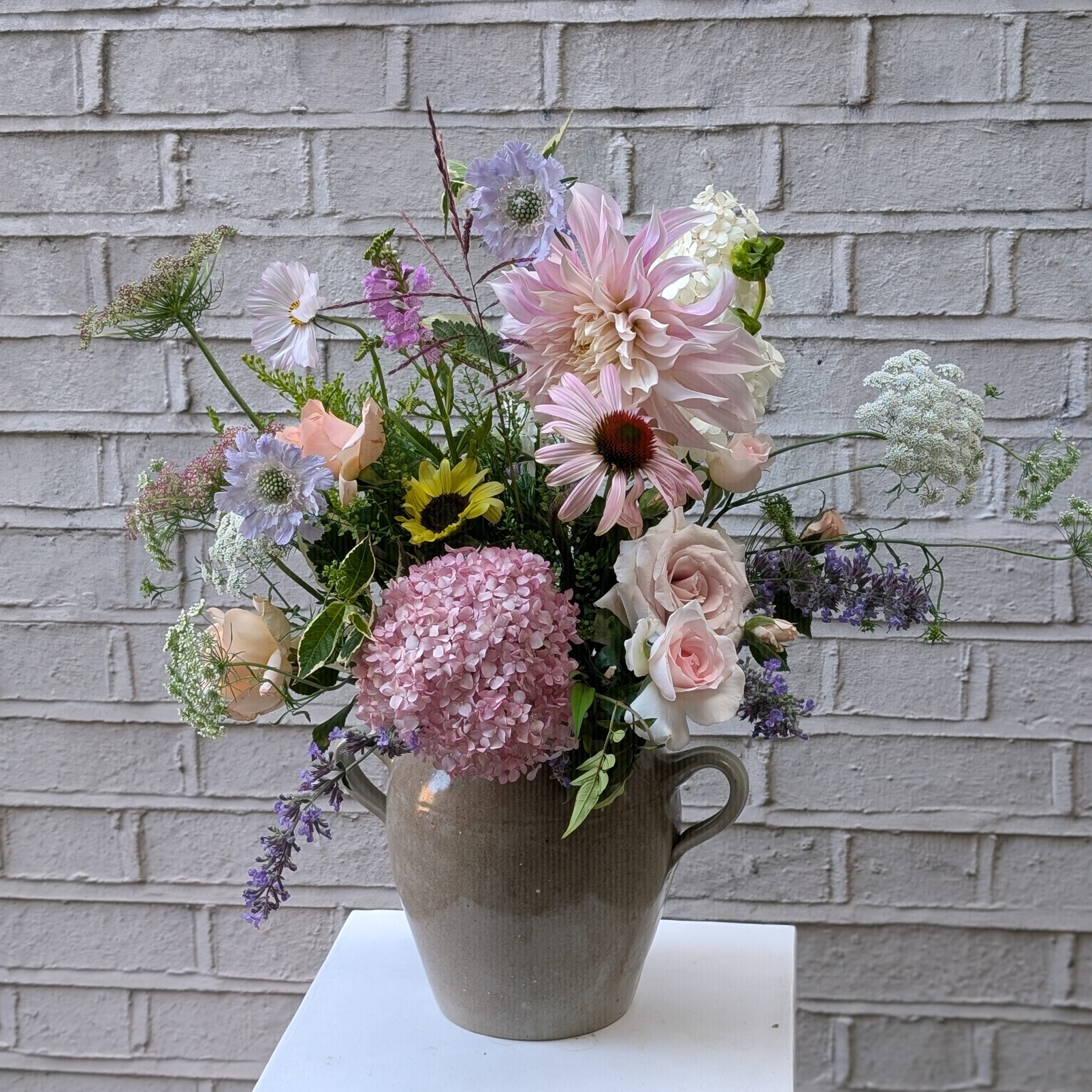 Hydrangea, Roses, Anemones, Scabious, Stocks, Veronica, Lisianthus, Queen Anne’s Lace, Statice, and British Foliage.